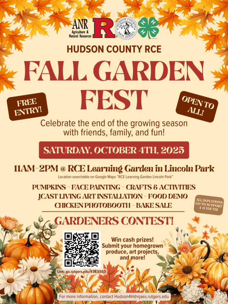 Hudson County RCE invites all residents including youth and adults to participate in the RCE Fall Garden Fest! During the event, youth can submit projects in our Gardeners Contest to win ribbons and cash prizes. 4-H Clubs, Scouts, schools groups, homeschool groups, and individuals are encouraged to submit projects!