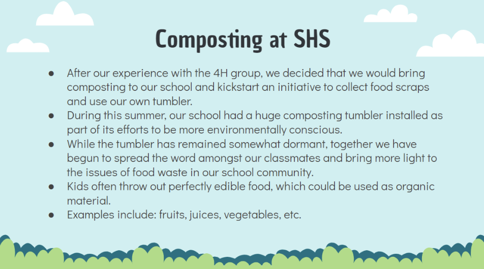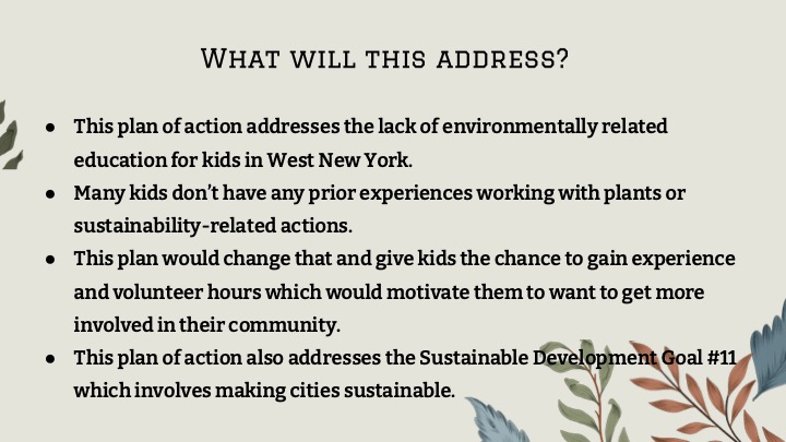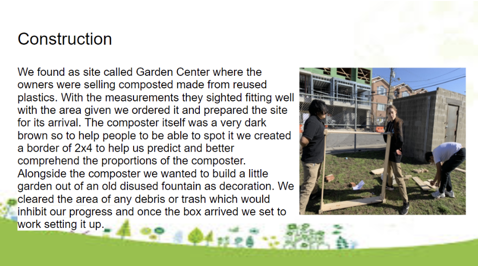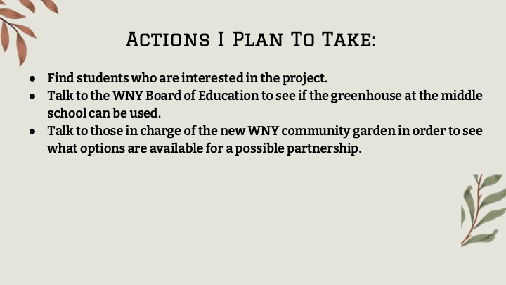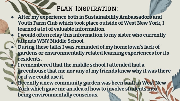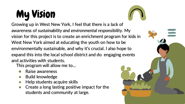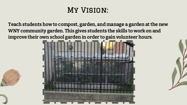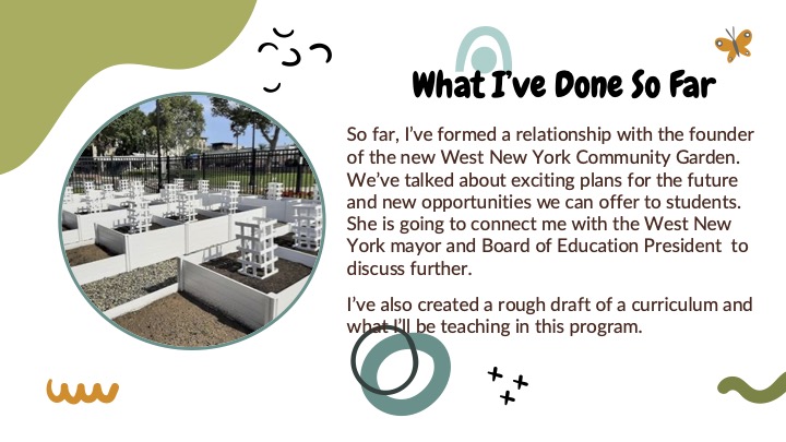 In her own words: “My project was about helping West Hudson Garden become further established, as it was a new garden at the time of the project. I wanted to create awareness around sustainability and urban gardening as well as make gardening more accessible for everyone. I developed social media posts about West Hudson and other 4-H programs. I made some bee and insect hotels to foster biodiversity. I also built multiple garden benches for West Hudson so that gardening could be more accessible.”